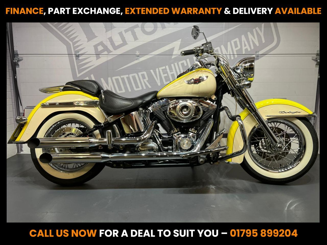 BUY ONLINE 24 HRS A DAY – FINANCE AVAILABLE – ALL CREDIT TYPES CONSIDERED This stunning 2009 Harley-Davidson FLSTN Softail Deluxe is a true head-turner finished in a rare two-tone yellow and cream combination, with just 9906 miles on the clock and a host of desirable extras, including a set of S&S exhausts that give it the soundtrack it deserves. Lovingly kept and beautifully presented, this Softail Deluxe blends modern usability with classic cruiser style. From the chrome-laden bodywork and whitewall tyres to the valanced fenders and tombstone tail light, it's every bit the retro showpiece — but with Harley's legendary build quality and real-world comfort. Service & Condition: - Just 9906 miles - Supplied with a fresh basic service & a fresh MOT - Excellent condition throughout - 3 months warranty included (extendable to 36 months) Spec Highlights: - S&S exhaust system - Factory chrome engine covers and trim - Whitewall tyres - Spoked wheels - Rider floorboards - Valanced front and rear fenders - Tombstone-style rear light - Solo touring seat with passenger pillion - Chrome front crash bars - Twin spotlights - Classic Softail hardtail-style frame Whether you're after a weekend cruiser, a garage showpiece, or a laid-back long-distance mile-muncher with timeless appeal, this FLSTN ticks all the boxes. For more info on this bike, call our showroom on 01795 899204 We've worked with Close Brothers Motor Finance to bring you a range of incredible finance options on this bike. Questions? Just give us a call or send an email and we're more than happy to help. If you want to see the rest of our stock and customer reviews, check out our website at www.rydermotorcycles.co.uk. you can also follow us on our Facebook page. Or even better, come along and see us.