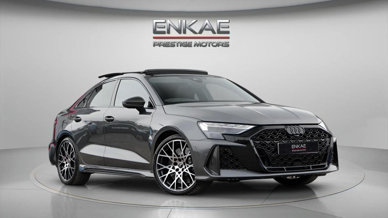 Enkae are proud to show you our 2025 Audi RS3 Saloon Carbon Vorsprung Facelift with fantastic specifications including: Sonos Sound System, Facelift, Carbon Exterior, Panoramic roof, Privacy glass, Super sport seats, Heated seats, Memory driver seat, Split folding rear seat 40-20-40, 4-Way lumbar support for the front seats, Carbon trim, 3 spoke leather multi function steering wheel, Ambient lighting pack, Collision avoidance assistant, Advanced key, Anti-theft alarm system, Auto dimming rear view mirror, Comfort key with SAFELOCK, Exterior mirrors, electrically adjustable, heated and folding, auto dimming on both sides, and memory function, Power operated tailgate, Storage and luggage pack, 12-V outlet in rear seat area, 2-zone climate control system, Audi virtual cockpit with RS Specific display, DAB Radio, Navigation system - High, Adaptive cruise assist with emergency assist, Adaptive cruise control, Audi pre sense front, Driver assistance system, Camera based traffic sign recognition, Heads up display, Hill hold assist, Park assist with parking aid plus, Reverse camera, Audi drive select, Progressive steering, RS Specific sport suspension, RS Sports exhaust, Top speed increase to 174mph, 19" 5-Y-spoke alloys, Darkened Matrix LED headlight with dynamic light design and dynamic turn signal, Digital matrix headlights, Headlight washer system, Black styling pack with black Audi rings logo, Apple car play Here At Enkae We Are A Well Established Car Sales Business Specialising In High-Quality Sports, Performance & Prestige Vehicles. We Are Delighted To Offer This Truly Magnificent Car COMPETITIVE FINANCE AVAILABLE*EXTENDED WARRANTIES AVAILABLE**LIFETIME PAINT PROTECTION AVAILABLE*PART EX WELCOME AT TRADE PRICE* NUMBER OF KEYS TO BE CONFIRMED WITH THE SALES PERSON* ALL VEHICLES MAY BE SUBJECT TO AESTHETIC STYLING PARTS INCLUDING UPGRADED ALLOYS, DE-CHROME, WRAPPING, CALLIPER PAINT, EXTERIOR MODIFICATIONS INCLUDING SPLITTERS, SIDE SKIRTS, SPOILERS, REAR DIFFUSERS, BUMPERS, GRILLE, WING MIRRORS AND MORE* PLEASE NOTE, A PROCOSESSING FEE OF £199 APPLIES TO ALL OUR CARS & IF A CUSTOMER WAS TO USE THEIR OWN FINANCE THEN A BROKER FEE OF £499 IS CHARGED ON ALL CARS. Please Note: Cosmetic Defects and General Wear and Tear are to be expected Inside & Outside of any Vehicle, Such as: Minor Scratches and Stone Chips etc. The Information & Specification Of All Vehicle Is The Best From Our Knowledge. Please Speak To A Sales Person To Confirm The Specification Listed On The Vehicle.