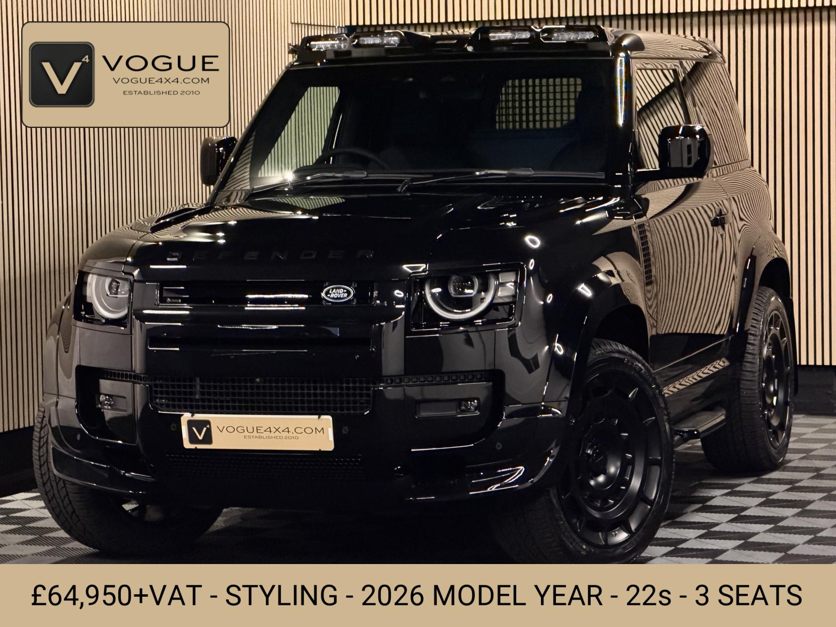 Vogue 4x4 proudly presents this exceptional 2026 Model Year Land Rover Defender 90 D250 X-Dynamic SE Hard Top Commercial, finished in Santorini Black with a full Black Resist interior. This well-specified example features 22” OCTA Style matt black alloy wheels with Yokohama all-terrain tyres, LED Roof Pod Light, LR Classic Mudflaps, extended gloss black wheel arches, front corner styling canards, roof spoiler, black side steps, and the extended exterior black pack. 2026 model year facelift example.