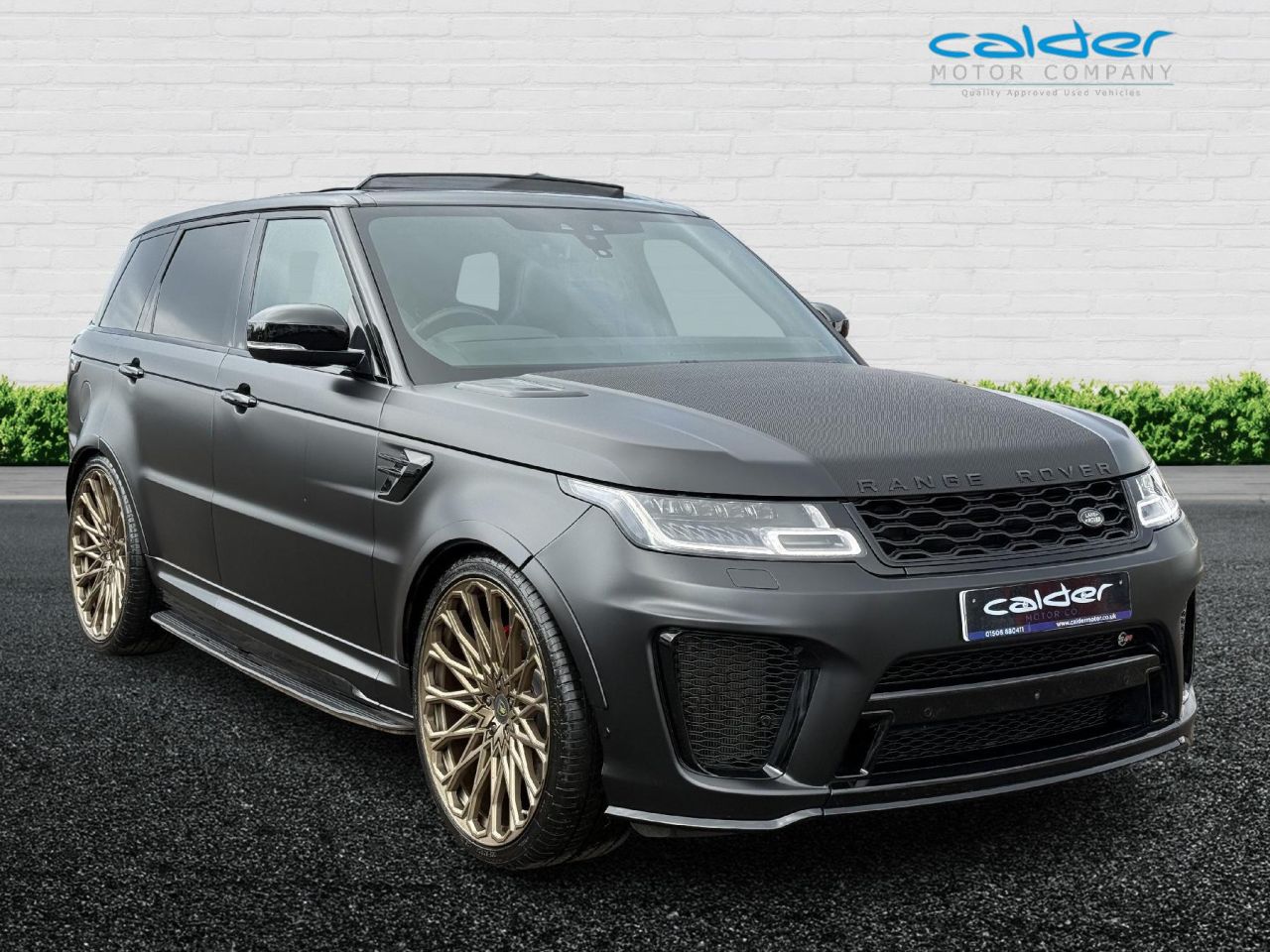 Simply Stunning SVR Finished in Santorini Black with the Full Body Satin Black PPF Wrap, Finished with Ebony Perforated Windsor Leather Upholstery and Piano Black Finishers. This car has only had One Former Keeper with a Full Land Rover Service History. This car looks outstanding and has had a fortune spent on it by its former keeper, its has been loved and cherished and was his pride and joy. Lovely factory spec with Opening Glass Panoramic Sunroof, Centre Console Fridge, Side Steps, privacy Glass, Heated Steering Wheel, Heated and Cooled Front and Heated Rear Seats, 360 Degree Cameras, Park Pro Park with Self parking, Detachable Tow Bar and so much more. Sitting on Near new 24" Bronze Barugzai Alloy wheels with 295/30/24 tyres costing £5500, Full Body Satin Black PPF Wrap with Carbon Fibre Bonnet Centre costing £3000, Upgraded Brake Discs £950, Ghost Immobilizer £495 Totalling £9945. This car is a proper example with Two Keys, Ghost Immobilizer and we will carry out a Full Service before collection. This Approved vehicle come's with our full care package including up to 2 years Platinum Plus Warranty with The Motoring Organisation, 1 years MOT, Full pre-delivery inspection, Full service ( if required ) and Fully Valeted. All Calder Motor Company Premier Approved vehicles are prepared to the highest standard in every way, cosmetically and mechanically. National delivery available. The Motoring Organisation Platinum Plus extended warranty available for up to 2 years. Face time or whats app video walk round available on request. SUNDAY'S BY APPOINTMENT ONLY. EVERY EFFORT HAS BEEN MADE TO ENSURE THE ACCURACY OF THE INFORMATION REGARDING THE VEHICLES SPEC HOWEVER ERRORS MAY OCCUR. CHECK WITH A SALESPERSON ABOUT ITEMS WHICH MAY AFFECT YOUR DECISION TO PURCHASE. Please feel free to Contact us via Phone, Email, Social Media. Nationwide Delivery, All Vehicles Are Fully Disinfected. Full Walkround Video, Face Time Etc.