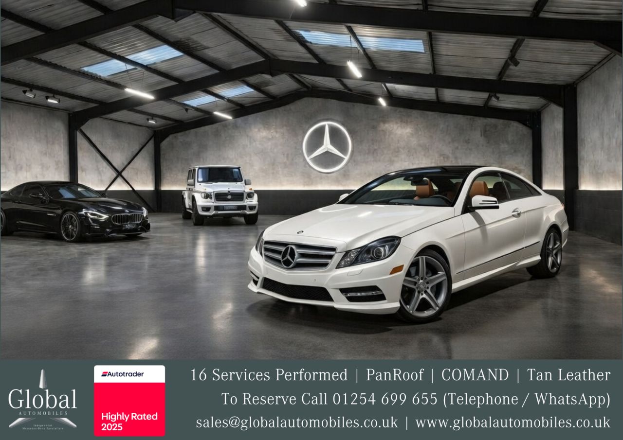 Buy with confidence from an Award Winning Independent Mercedes-Benz Specialist! We are delighted to offer our beautiful Mercedes E Class E350 CDi "AMG Sport" Automatic 3.0 V6 Diesel Pillarless Coupe finished in the highly sought after "Calcite White" and fitted with a Natural Beige Nappa Leather Upholstery (Electric, Heated and Orthopaedic) with matching door cards. This is the E Class you should be buying - Rare Factory Ordered Specification and in Superb Condition! Fitted with the flagship 3.0 V6 CDi powerful yet amazingly economical engine which is normally suited to the S Class and G Wagen. Lastly supplied by ourseleves in 2021 to Mr and Mrs Pemberton, this vehicle has been meticulously maintained (16 Service Stamps in total, 9 of which are Mercedes-Benz Main Agent) and this is evident when driven and seen. This Mature Owned vehicle is supplied with its Original Manuals, Full Mercedes-Benz and Specialist Service History Record, Two Keys, MOT until February 2027, HPI Clearance Certificate and a Full and current V5 Logbook. This Vehicle has just been Serviced (Major Service B) at the Current Mileage and is ready to drive away. The Specification; AMG Sports Package, AMG Styling Package, Multi Contour Orthopaedic Heated Leather Interior, Glass Tilt and Slide Panoramic Sunroof, COMAND Media System; Post Code Entry Navigation, Bluetooth Telephone, Radio, CD / DVD Changer and Multiple Media Input Interface. Intelligent Lighting System (iLS) with Bi Xenon Headlamps and Automatic High Beam Switch (iHC), Signature LED Day Time Running Lamps, Cornering Illumination, Rear View Parking Camera, Parking Guidance (Front / Rear - Acoustic and Visual Parking Sensors), Headlamp Cleaning Equipment, Ash Tree Wood Interior Trim, Interior and Exterior Automatically Dimming Mirror, Lights Package, Power Folding Mirrors, Theft Protection Package, Rear Seatbelt Indication Status, Automatic Child Seat Recognition, Tyre Pressure Loss Warner, Sports Suspension, Anti Theft Alarm System, Sports Multifunction Steering Wheel, Dual Cup Holders plus many more features. This vehicle is a joy to drive, and the first person to see and test drive will be buying this fantastic example. For further details please contact our sales team on 01254 699 655 - Ref No - 12 - Established in 1985 We are a family run Mercedes-Benz Specialist - Global Automobiles is one of the leading Mercedes-Benz Specialist offering Car Sales and Servicing - Conveniently located in the town centre of Blackburn we are just 5 minutes from the M65 enabling great road connections from the south and north of the country - Please call 01254 699 655 - Vehicles can be secured with a small deposit - BB2 3RG - Every effort has been made to ensure the accuracy of the above advert information, but errors may occur. Many vehicles use a man made substitute for leather which is widely referred to as leather, please take this into consideration when purchasing your next car.