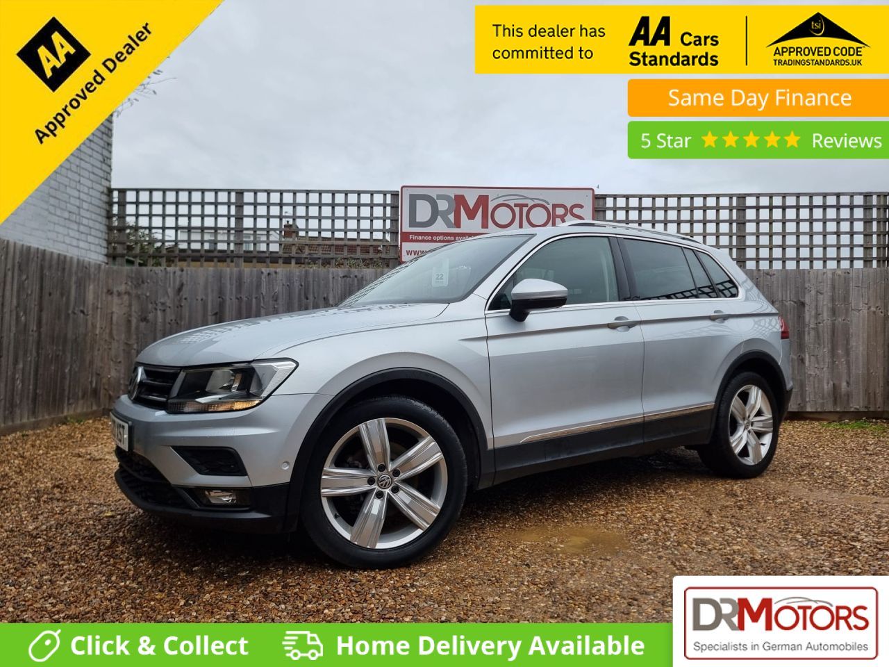 Volkswagen Tiguan 1.5 TSI EVO Match SUV 5dr Petrol, available now with a March Special Offer including 18 months Nationwide Gold Warranty included in the price. This vehicle is ULEZ compliant and presented in very clean condition both inside and out – the first to see will buy. It comes with satellite navigation, two keys and a full service history with an impressive 10 recorded services. The MOT is valid until December 2026, offering peace of mind to the next owner. This Tiguan is well equipped with a rear parking camera, front and rear parking sensors, Bluetooth handsfree, cruise control, DAB radio, USB and AUX connections, privacy glass and stylish 19-inch alloy wheels. It also benefits from a tow bar, generous boot space and a lovely colour combination. The car is very fuel efficient with low running costs and is in lovely overall condition, representing excellent value for money. Finance options are available – please call us to discuss what we can offer on this vehicle. We currently have over 150 DR Approved Used Cars on site and are proud winners of the CarGurus Top Rated Dealer Award in 2020, 2021 and 2022. Deposits can be taken to secure this car, and full finance details are available on our website. Every effort has been made to ensure the accuracy of the information provided; however, please check with a salesperson regarding any items that may affect your decision to purchase. At DR Motors, we are a Trading Standards Approved Garage and an AA Approved Dealer, highlighting our commitment to quality, integrity and customer satisfaction. Each vehicle also includes 12 months free AA Breakdown Cover.